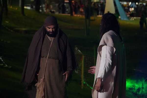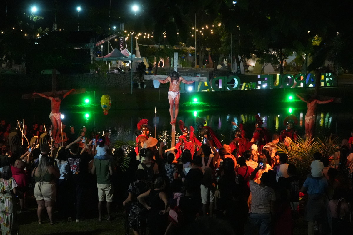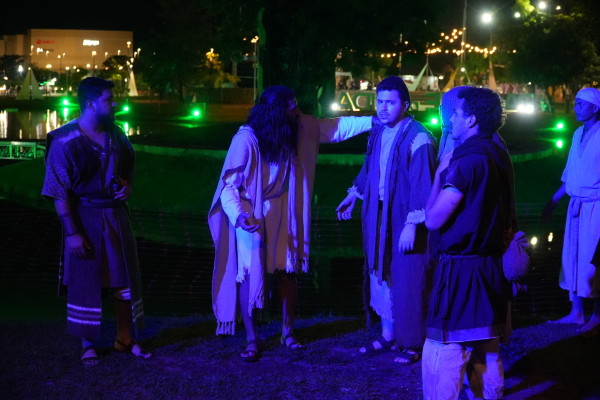 O Parque da Cidade se transformou em uma verdadeira cidade cenográfica a céu aberto durante a apresentação do espetáculo “Jesus de Nazaré – Especial da Paixão”, encenado pelo Teatro Nova Canaã, nesta quinta-feira (02). Como parte da programação da Páscoa no Parque, realizada pela Prefeitura, a peça proporcionou uma experiência única ao público, que não apenas assistiu, mas caminhou junto com os atores, acompanhando cada cena da trajetória de Cristo.